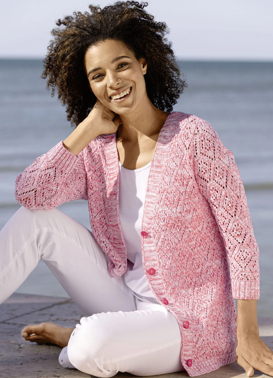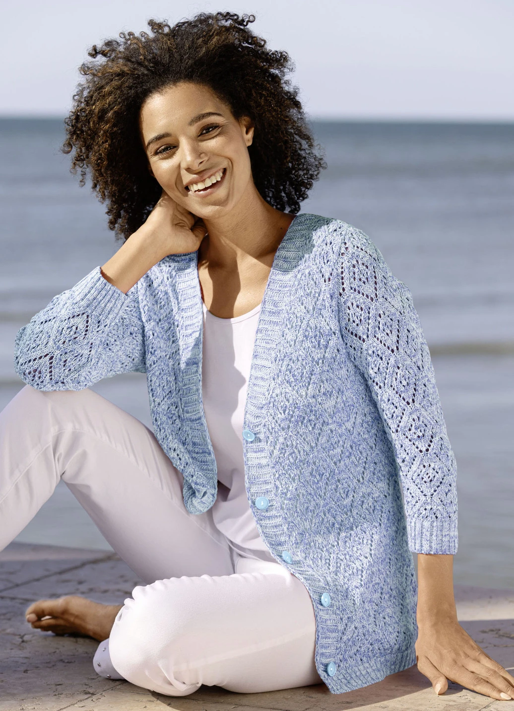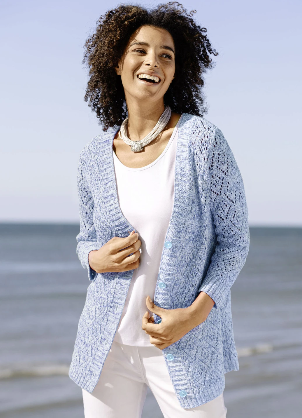 Modische, durchgeknöpfte Strickjacke aus Melangegarn, mit streckendem Ajourmuster in Rautenoptik, V-Ausschnitt, Ärmeln in modischer Länge sowie gerippten Abschlüssen.