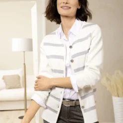 Strickjacke mit nachhaltig recycelter Baumwolle in Oliv-Orange-Multicolor und in Größe 38.