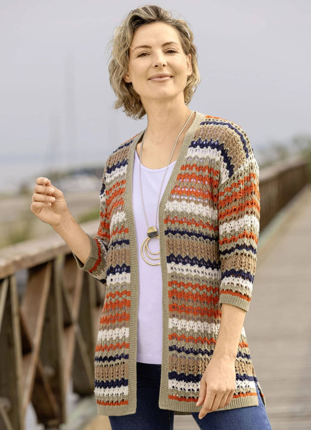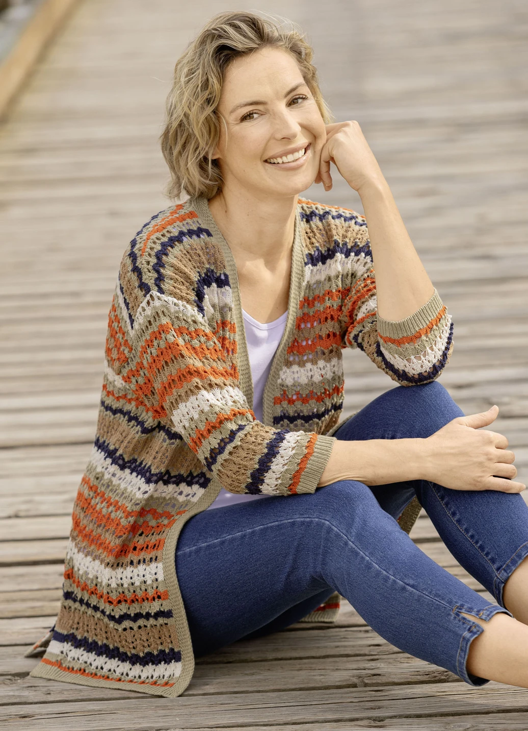 Lässige, verschlusslose Strickjacke in Oliv-Orange-Multicolor, mit hübschem Ajourmuster in Streifenoptik allover, V-Ausschnitt, überschnittener Schulterpartie, 3/4-langen Ärmeln, Seitenschlitzen sowie gerippten Abschlüssen.